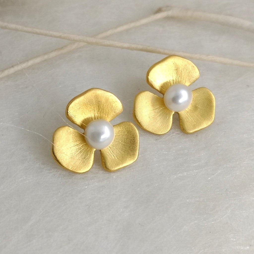 LoRe - Pendientes botón grande con perla cultivada en plata chapado oro 18 kilates